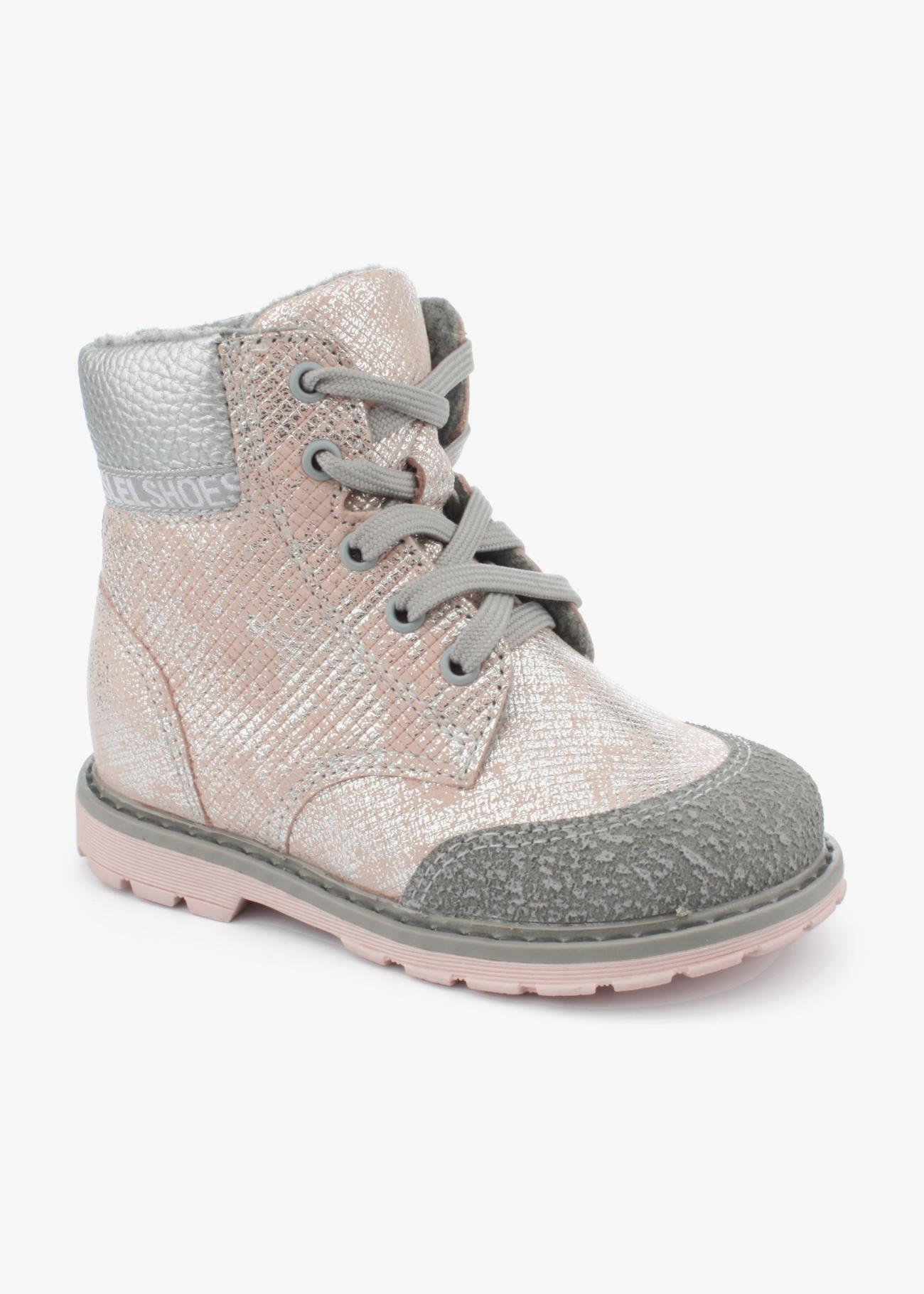 Очень стильные и красивые ботинки Лель для девочек. Красивый переливающийся пудровый оттенок. Выполнены снаружи из натуральной кожи. Внутри утеплены шерстяной байкой. Температурный режим от -5ти до +10 градусов тепла. Носочная часть с защитой от сбивания. Каблук Томаса, жесткий задник, подсводник. Очень легкие по весу. Качество исполнения превосходное. Рекомендуем!