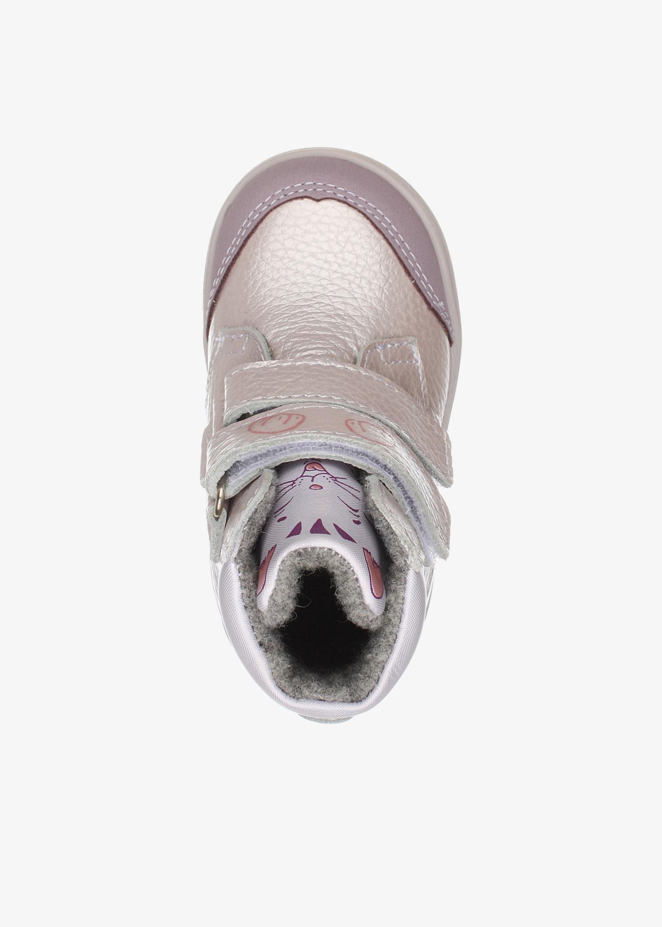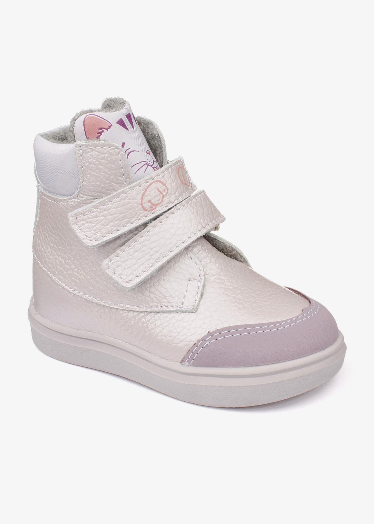 Очень красивые демисезонные ботиночки Котофей. Носочная часть с защитой. Снаружи натуральная кожа, внутри шерстяная байка. Стелька из войлока. Жесткий задник. Ботиночки очень легкие и теплые. Язычок выполнен с изображением котика. Температурный режим ориентировочно от +10 до -5ти градусов.