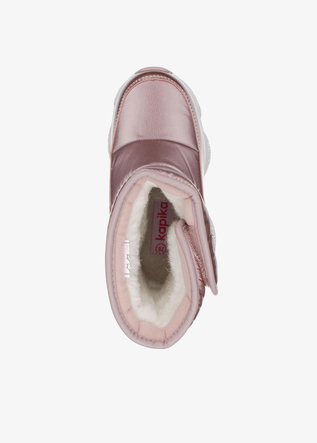 Стильные зимние дутики Kapika. Нескользящая подошва. На липучке, модель удобно снимать и обувать. Верх модели выполнен из гидрофобного текстиля (отталкивает воду, не пропускает влагу) и экокожи. Материал подкладки - шерстяной мех. Идеальная обувь для активных прогулок в холодное время года. Модель оснащена теплой стелькой с фольгой, что уберегает от охлаждения и обеспечивает сохранение тепла в течение длительного времени.