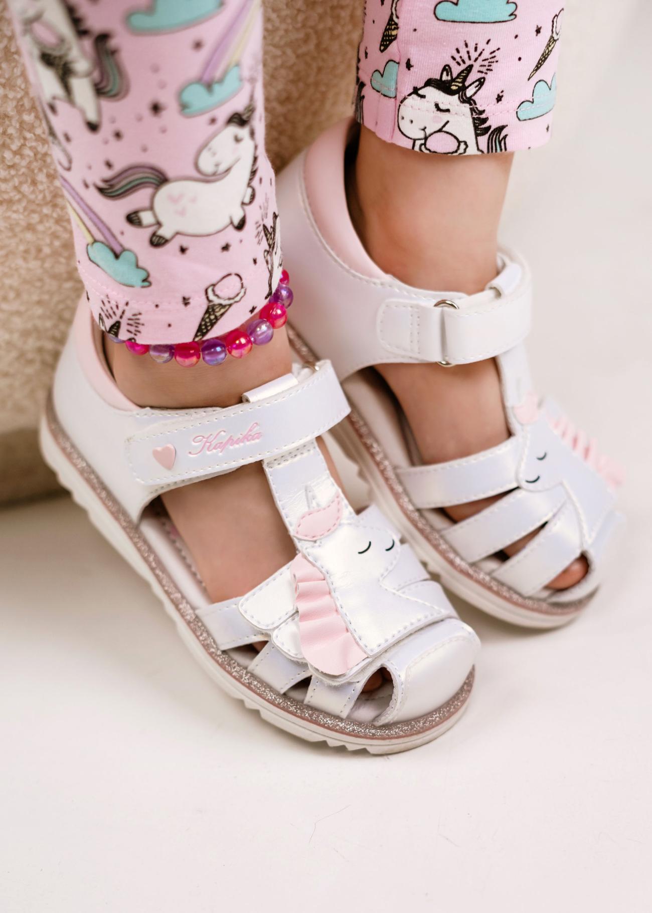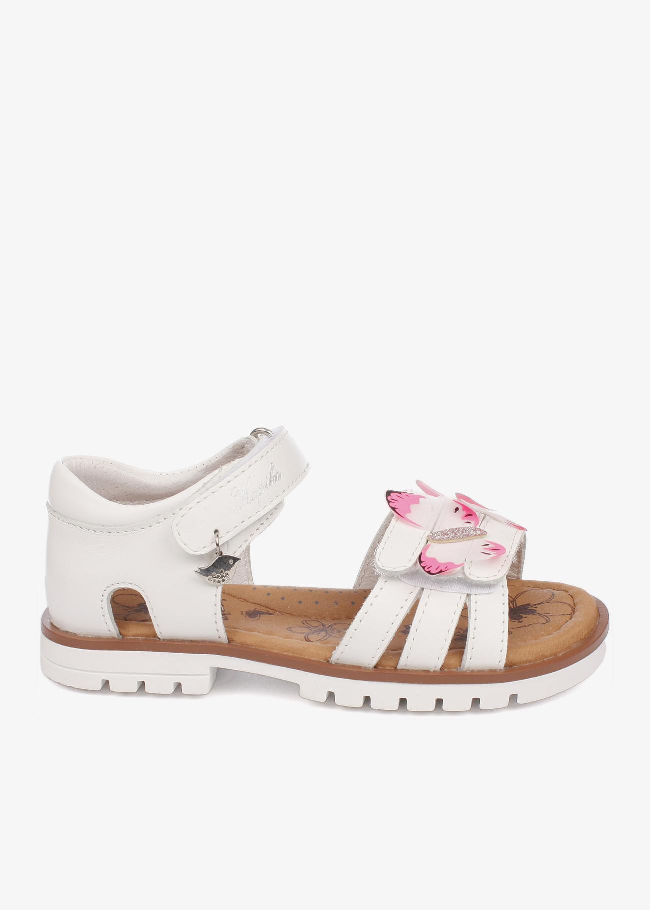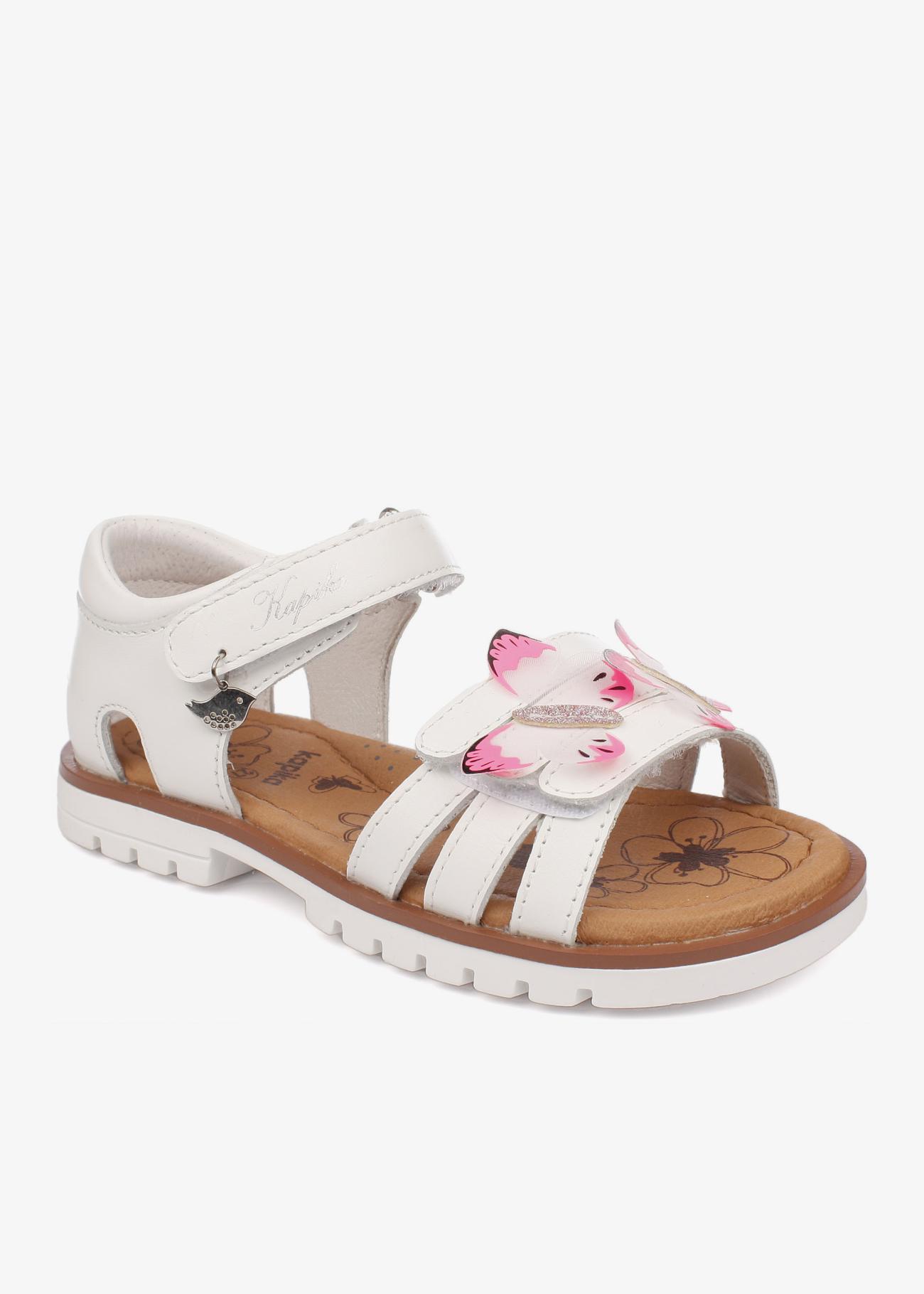 Сандалии для девочки с с верхом из натуральной кожи. Подкладка и стелька из натуральной кожи. Анатомическая стелька, подсводник, гибкая носочная часть. 2 липучки регулируют полноту.