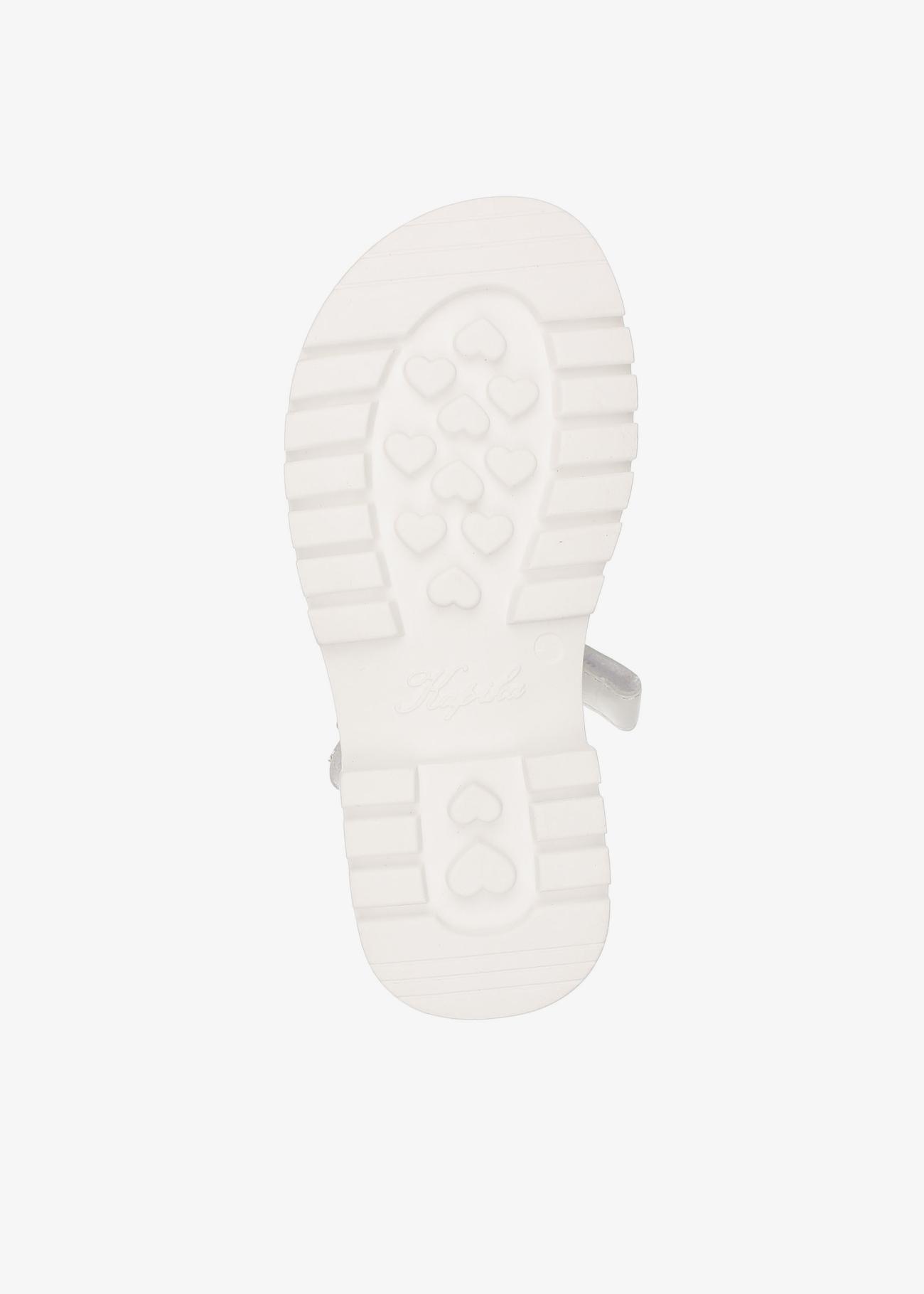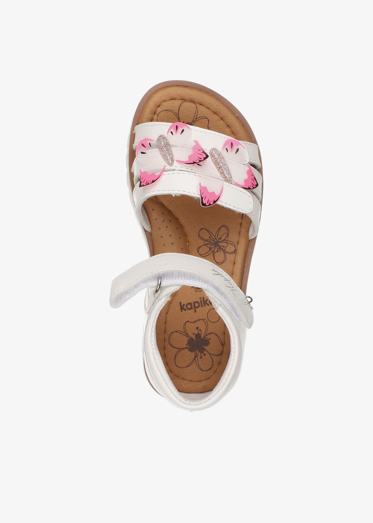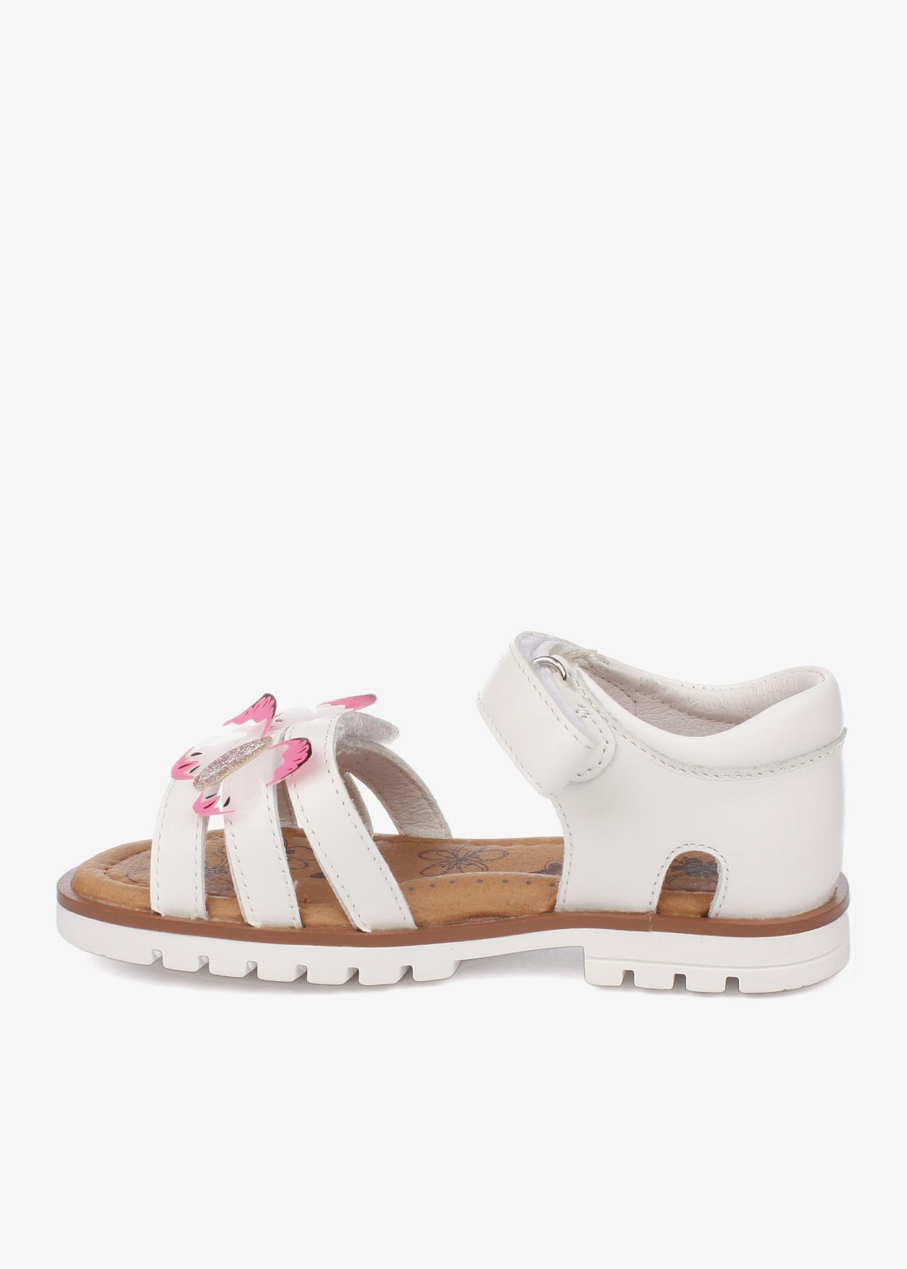 Сандалии для девочки с с верхом из натуральной кожи. Подкладка и стелька из натуральной кожи. Анатомическая стелька, подсводник, гибкая носочная часть. 2 липучки регулируют полноту.