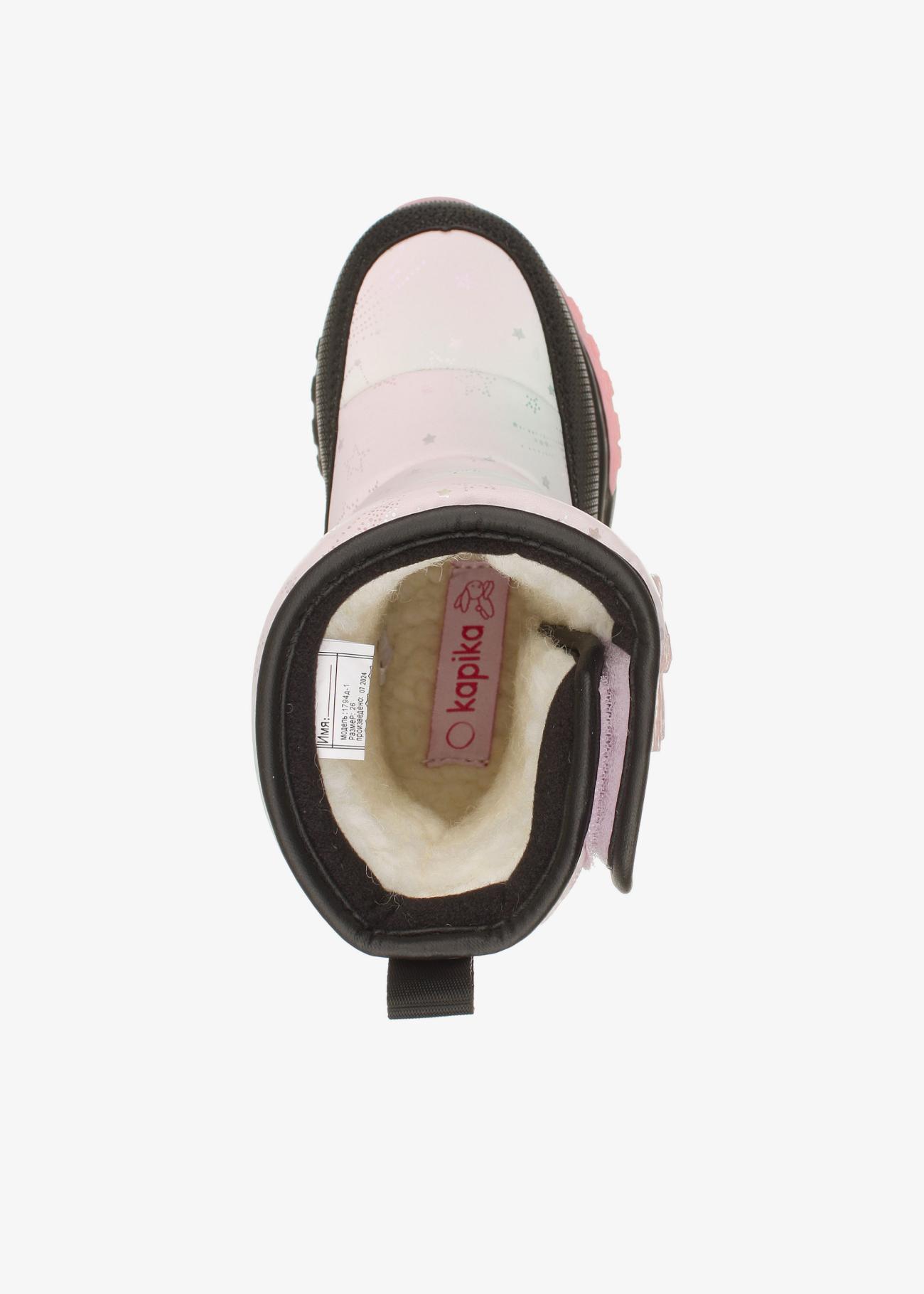 Стильные зимние дутики Kapika. Нескользящая подошва. На липучке, модель удобно снимать и обувать. Верх модели выполнен из гидрофобного текстиля (отталкивает воду, не пропускает влагу) и экокожи. Материал подкладки - шерстяной мех. Идеальная обувь для активных прогулок в холодное время года. Модель оснащена теплой стелькой с фольгой, что уберегает от охлаждения и обеспечивает сохранение тепла в течение длительного времени. Рекомендуем брать на размер больше от своего, т.к. мех достаточно плотный и занимает некоторое место в ботинке!